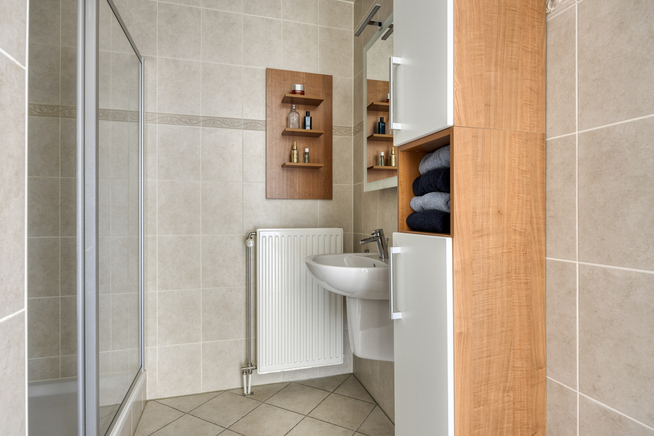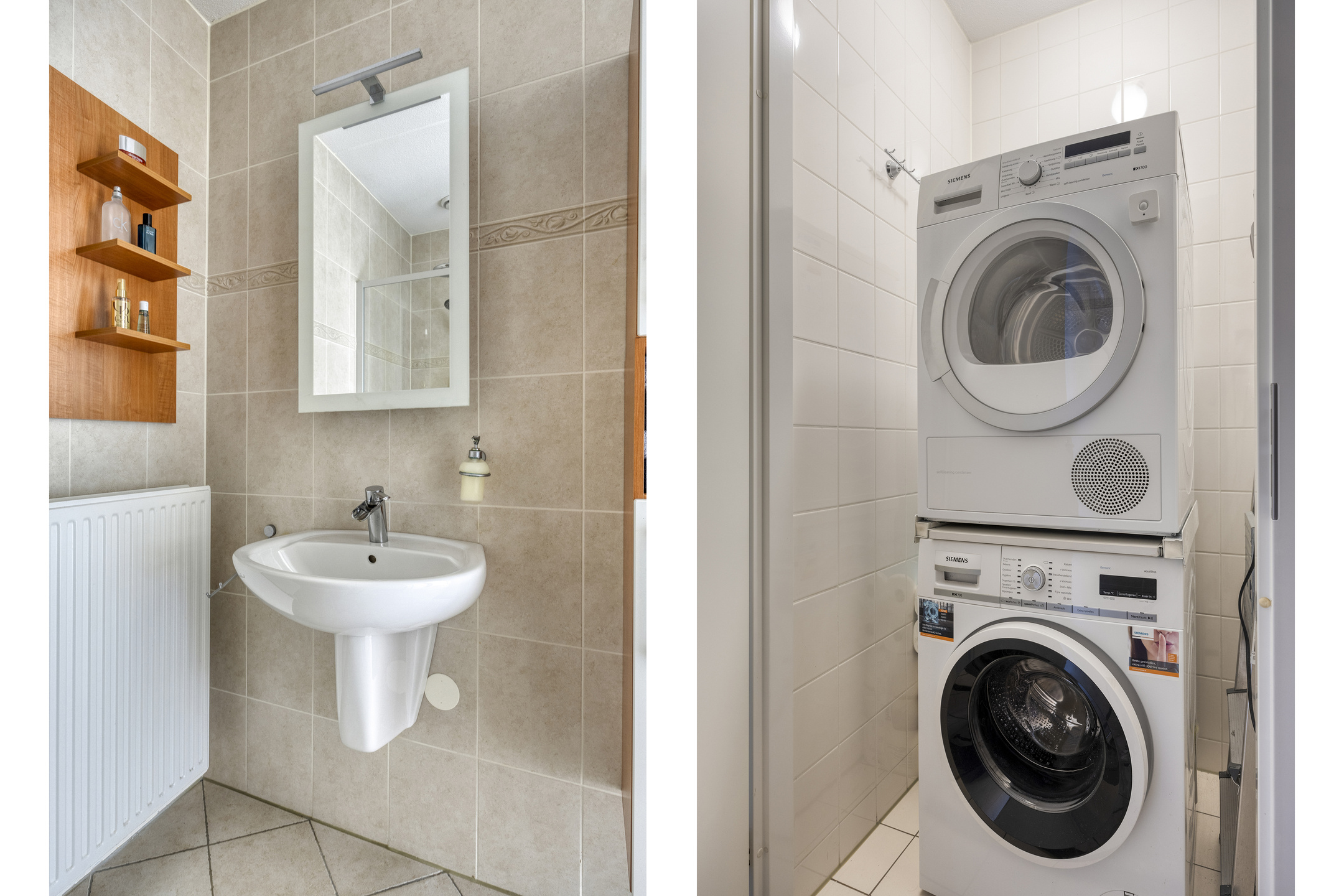 In het appartement bevinden zich twee comfortabele slaapkamers die beide voorzien zijn van ingebouwde kasten, praktisch en ruimtebesparend. De hoofdslaapkamer biedt voldoende ruimte voor een tweepersoonsbed en extra meubels zoals nachtkastjes. De kamer vormt een ontspannen plek om tot rust te komen na een drukke dag. De tweede slaapkamer is uitermate geschikt als thuiswerkplek, logeerkamer of hobbyruimte. De badkamer is volledig betegeld en uitgerust met een douche, een wastafel en een praktische kast. Vanuit de badkamer heeft u direct toegang tot de wasruimte waar u aansluitingen vindt voor de wasmachine en wasdroger. Daarnaast is er in de hal nog een separaat toilet aanwezig, ideaal voor gasten en extra gebruiksgemak in het dagelijkse leven.